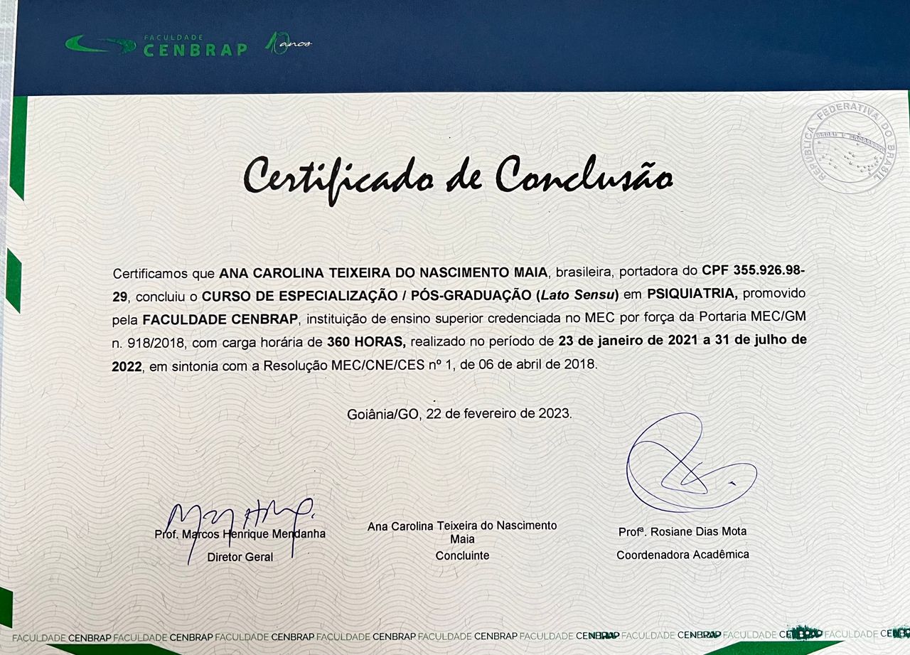 Sou médica de Família e Comunidade, pós-graduada em Psiquiatria e especialista em Medicina Endocanabinoide.